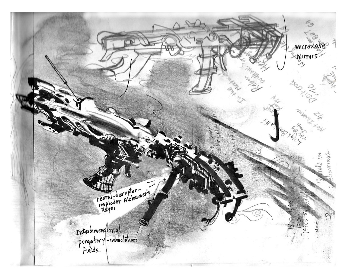 I inserted the final templates, and more cook time in the printer brought out the “morphological exuberance” of gnarl, knob, hook. My weapon boasted an exuberance of Lethe morphology, a plasma gun capable of inflicting corky wounds and cat face disfigurements in time, and displacement pulses in matter. It was a screamer, a jammer, a buzzer. A bitch. A neural disruptor-imploder of Alzheimer’s Rays, throwing interdimensional purgatory immolation fields in a narrow to wide array.