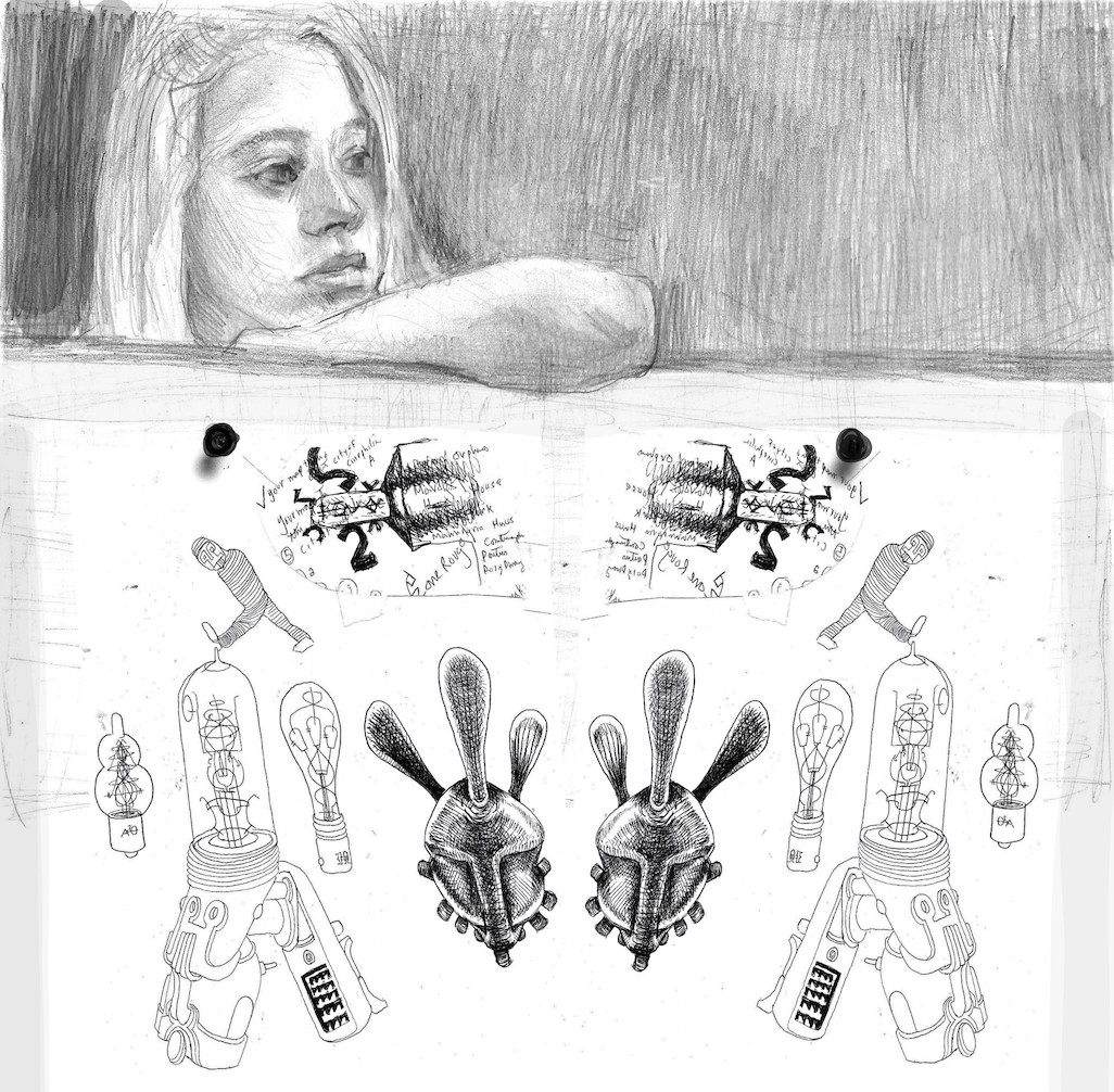 We stopped breathing. Jeremy’s bent antenna gave a goodbye salute. I let out a breath and Billie said “Crap,” lingering a little with her head doing that humpy-dumpty totter on the cubby wall between silence and something else, sometimes a question about nothing much, sometimes a little less of nothing into something I couldn’t get: What’s going on? What’s doing? Trying to answer, I always drew a blank. In my head. On a sheet of paper. Or with a flash behind my eyes, a buzzing retinal fatigue of the brain. I’d learned to smile it away. Talk bugs.