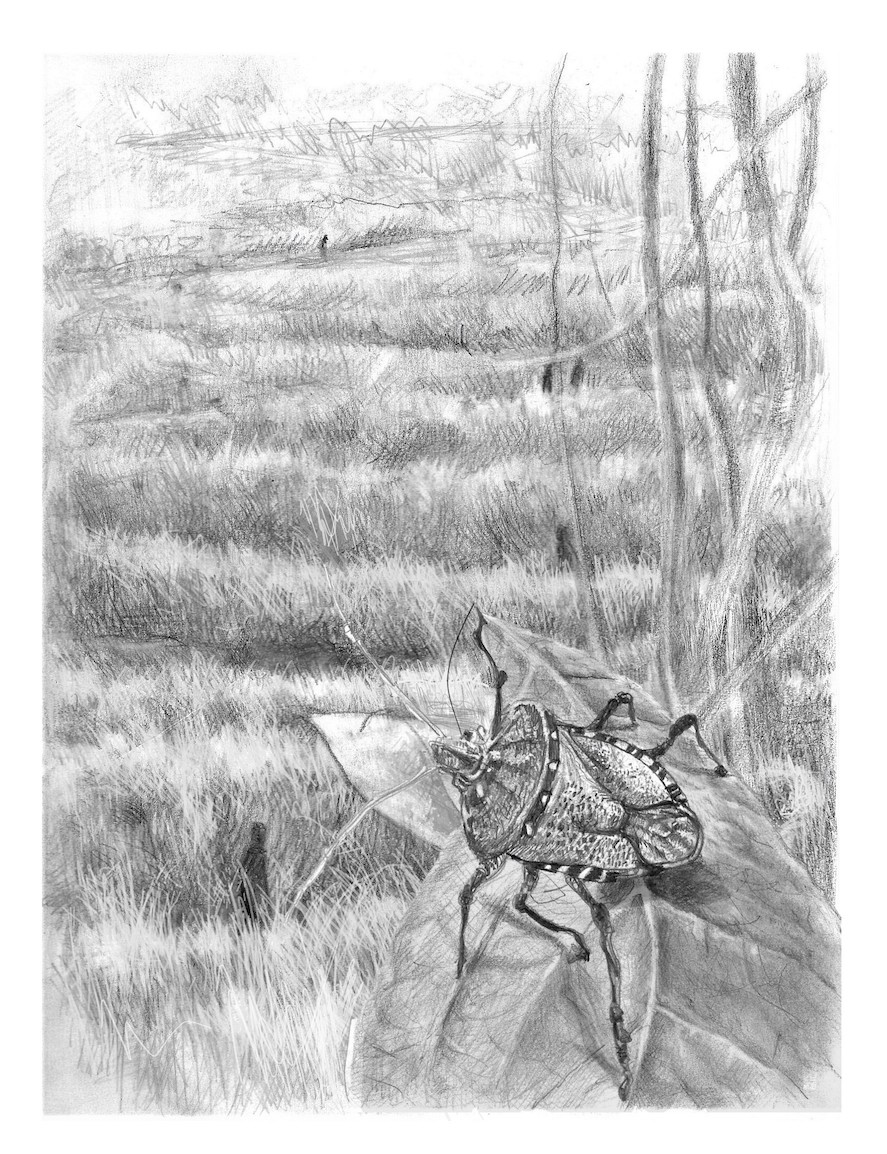 I’d been creating some lesson plans about insects for my advanced ESL class. Sort of. I sketched the failing Jeremy and googled more about stinkbugs. I’d already learned Jeremy belongs to the Pentatomidae super family of bugs, for its five-sectioned antennae, where a lot of its brains are located. It’s also known as a stink bug for its defensive odor, likened to coriander, cilantro, or skunk. Since the only way I had ever learned was to teach, my days were spent stringing beads of teaching moments from stuff around me, at the moment bugs, and consciousness. Lately the thread had broken, the moments and beads spilling out on the floor. Life was tidying up, wasn’t it. Maybe this was a juncture moment, why my machine had delivered me to this now. Maybe the answer to why I kept going blank with Billie, with everything.