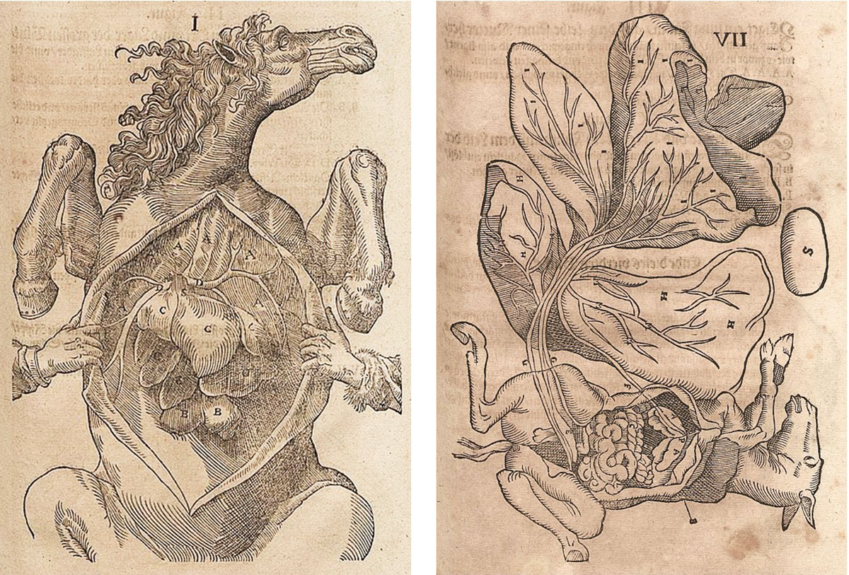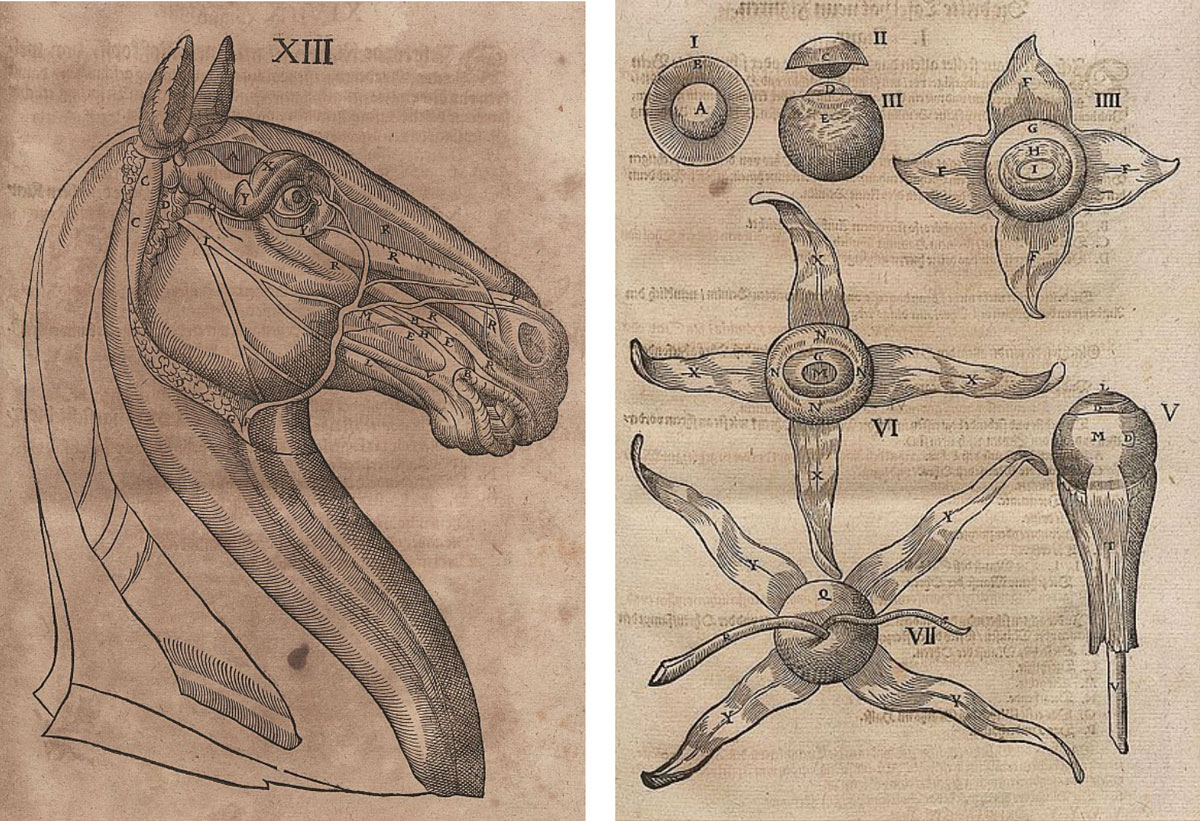 The first formulation of blood as something that flows inside us came from a sixteenth-century Spanish ferrier’s manual. In 1547, while describing how best to nail a shoe to the hoof, Francisco de la Reyna wrote, “la sangre anda en torno y ruedo por todo los miembros y venas.” The blood travels around and rolls through all the limbs and veins. By the sixteenth century, so much of the Western world depended on the health of horses that veterinary and human medicine developed as almost parallel sciences. In 1598, Italian anatomist Carlo Ruini wrote the first monograph of a species besides man. Dell’anatomia et dell’infirmita del cavallo is seven hundred fifty-nine pages of equine anatomy detailing a body I think I recognize in a language I cannot read. The pictures are so fine that da Vinci is rumored to have drawn them. Masterpieces, a piece of some master, dozens of crosshatched cross sections of the horse split into lines so thin there are shadows in the crease of each muscle. I turn the page. I crawl in.