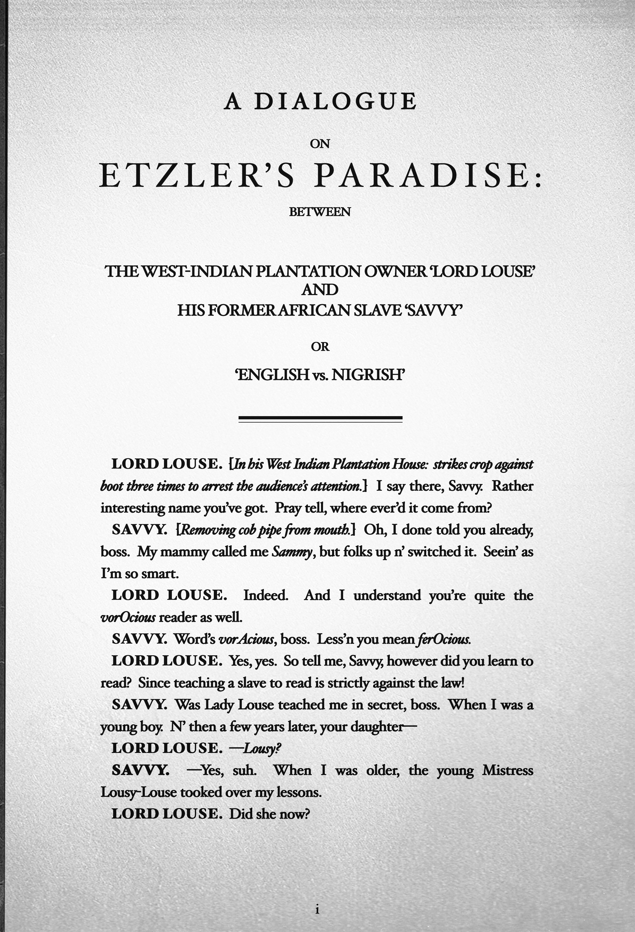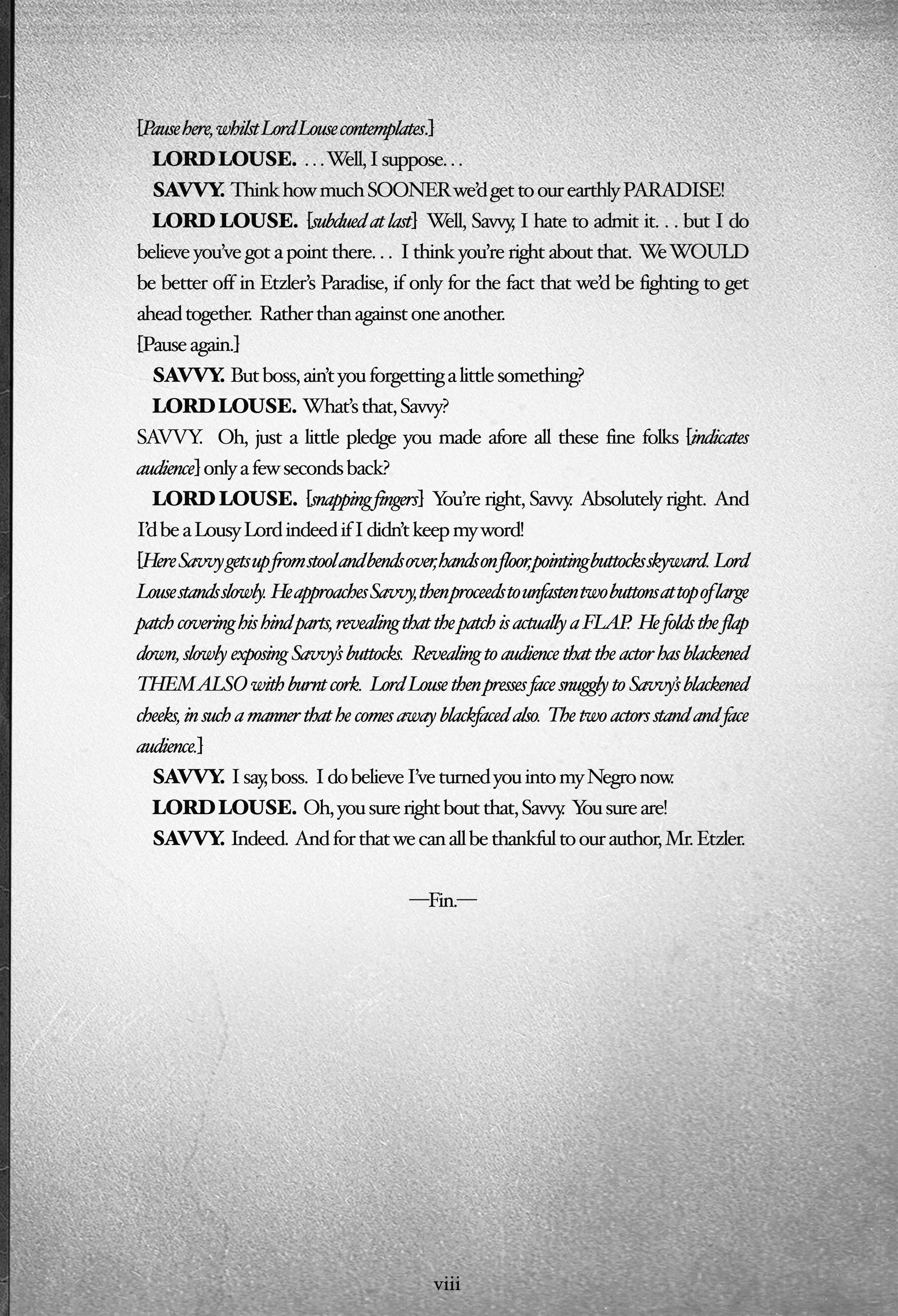 Son, you got to realize that what Mr. Etzler gave us in this play was a biting satire. Directed at some of those very members of he audience. Some of whom caught on good enough—others remaining oblivious—but it hardly seemed to matter. Because after a time everybody was laughing to we heart’s content. Finally Lord Louse unbuttoned the patch over Savvy’s upturned buttocks (the audience realizing then that Mr. Etzler had blacked he bamsee-cheeks too). And when Lord Louse bent down to kiss his ex-slave’s arse, actually pressing his face snugly to it and coming away blackfaced heself—so now the reversal was complete—by then we couldn’t hold weself back. Not only from laughter and applause but shouts of Bravo! requests for Encore! Even the French comte could be seen getting up quiet from out his chaise lounge at the far corner of the deck, offering the actors he standing ovation. And Captain Damphier was so pleased with the performance he commanded he sailors to serve us another round of rumpunch.