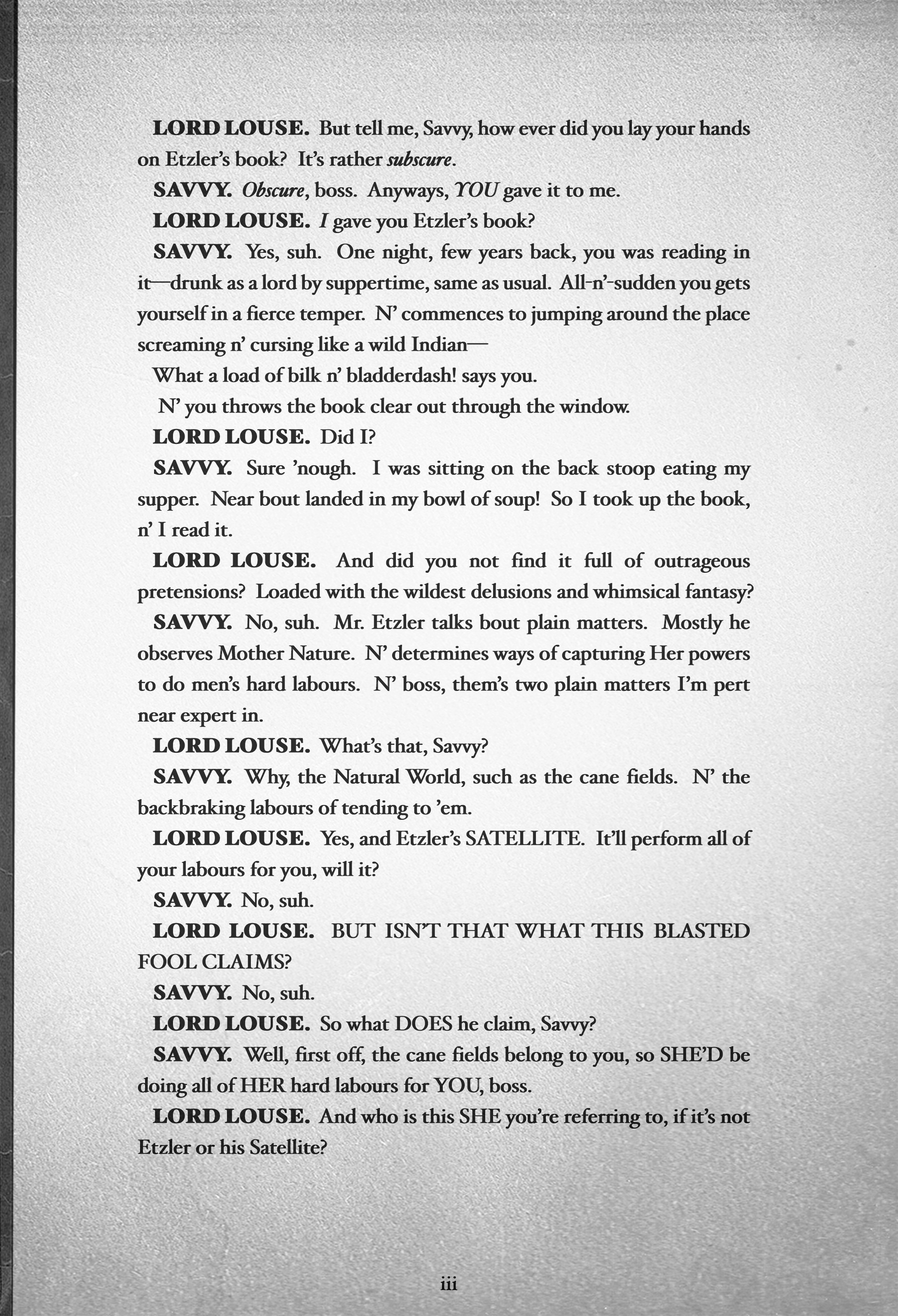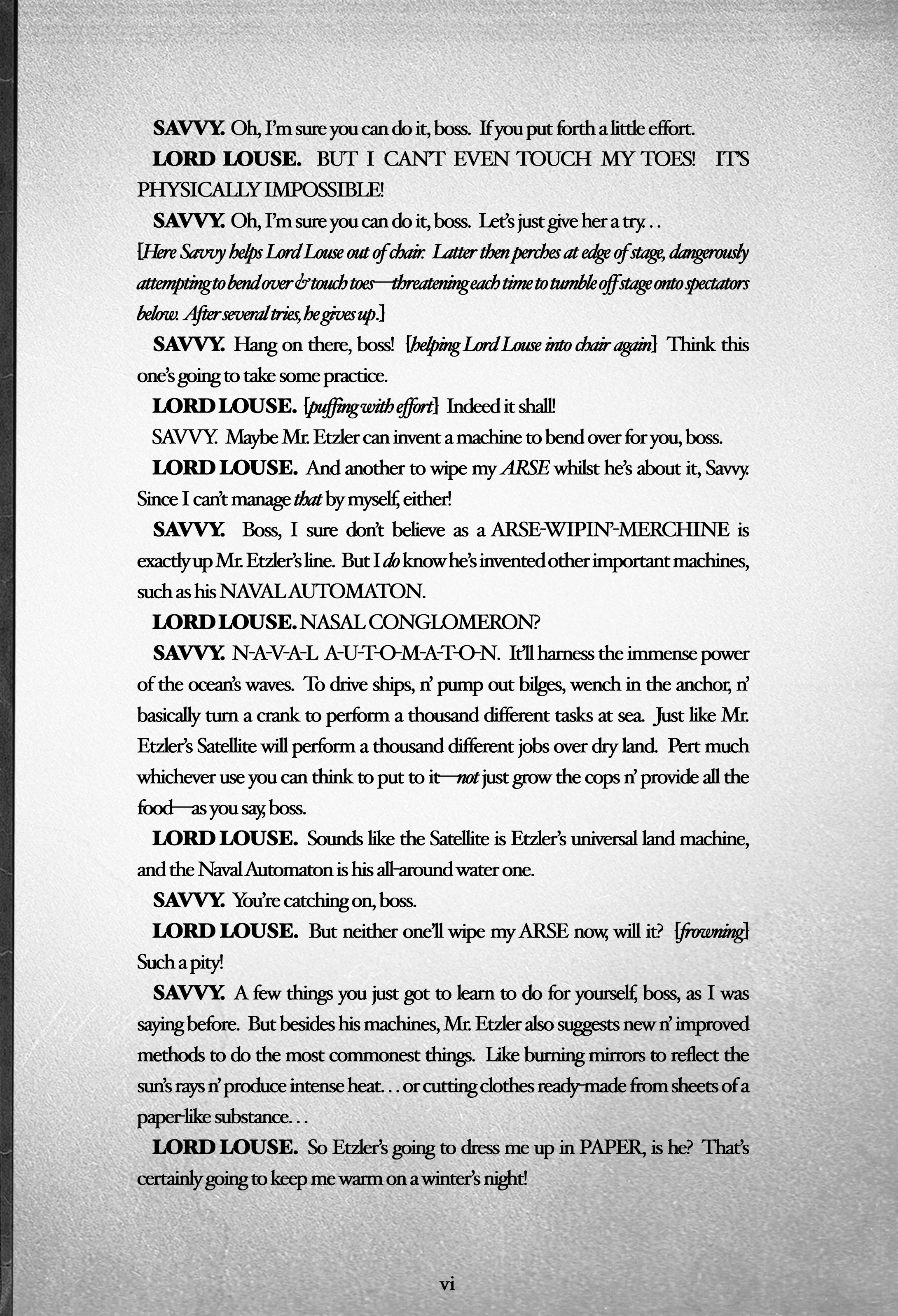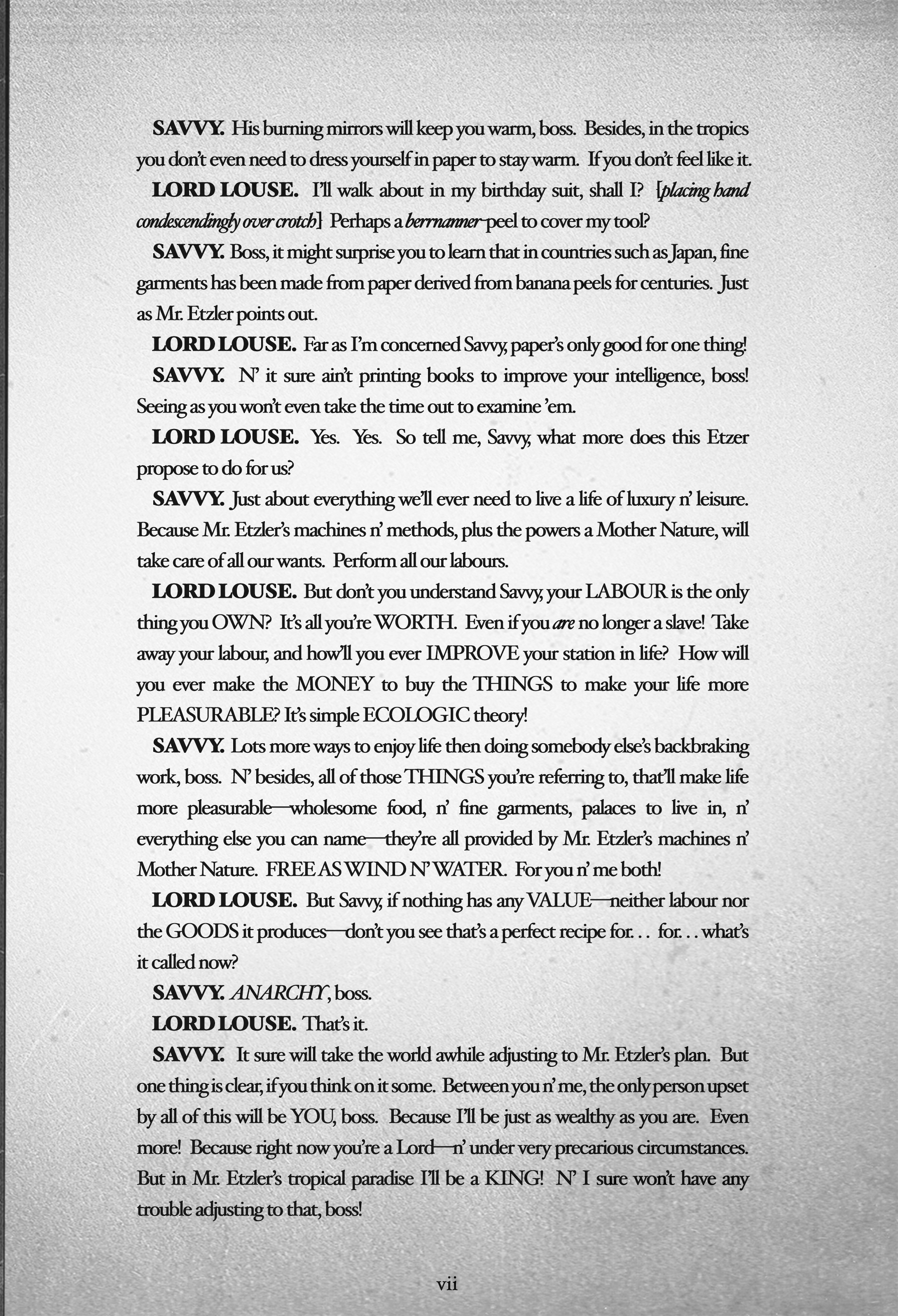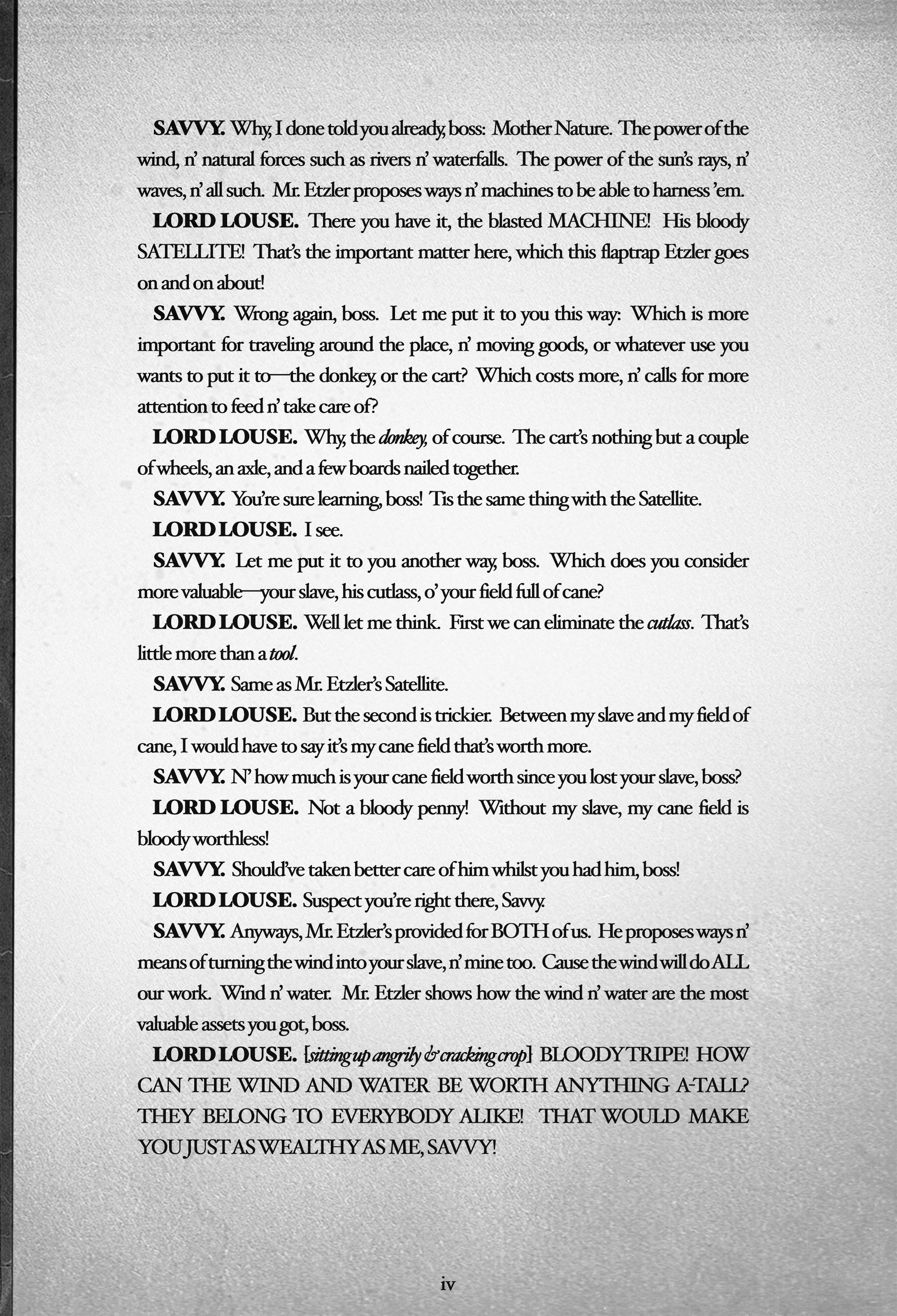 As with all of his writing in the English language, down to his letters of informal correspondence, Mr. Stollmeyer edited the text for clarity and proper usage—even in he native German, Mr. Etzler’s writing tended towards the archaic and obscure. Occasionally even the sublime. Mr. Stollmeyer checked the manuscript over for grammatical and spelling errors. Due to the creative nature of this particular work, more than usual care was taken to assure the fluidity of the spoken language contained in the script.