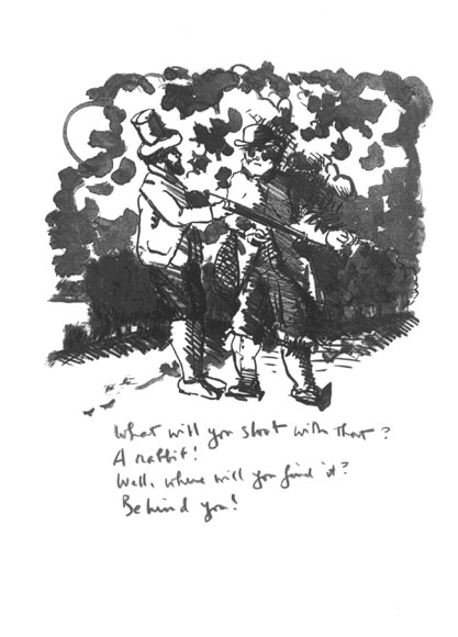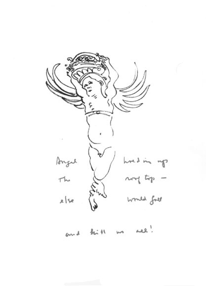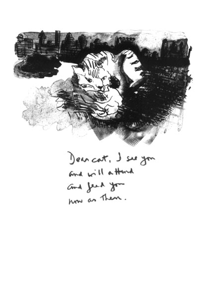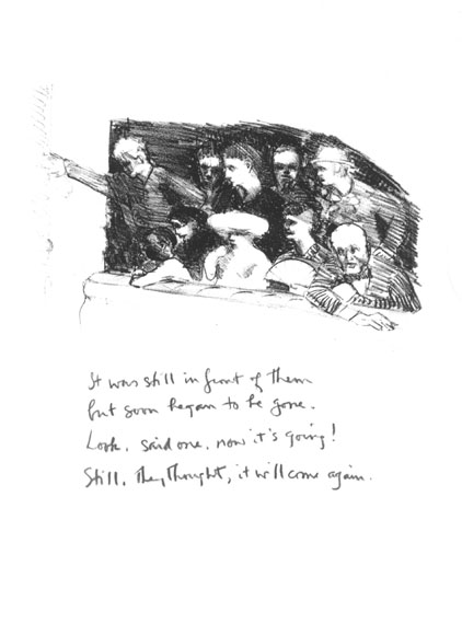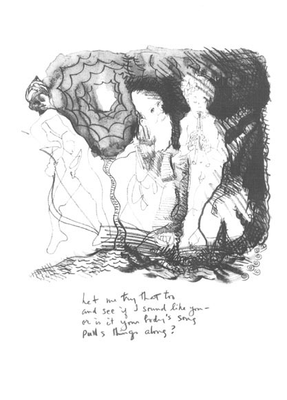 How it did still amazes me. I knew Archie had brought with him the litho sheets with the fifty-four drawings. I had tried a few brief quatrains to see how that form might work in context with the xeroxed images he’d sent me earlier. But when we went into a back room at the museum, and Archie took out the litho sheets and asked if I might try to do a text for each image there and then, I was intimidated, not to say, shocked. Still I said I’d try, and so we set out. The procedure was for Archie to slide me an image on the litho paper. I’d try a take or two to get the feel, writing on a usual sheet of typing paper, then resolve on a particular quatrain, put it with the litho sheet related—and on to the next. So we worked thorugh the afternoon until, finally, all fifty-four poems were finished. Then I copied each poem under its respective image on the litho sheet. I recall we pretty much closed up the place—as ‘twere in dream! I felt as if I had been in some fantastic traffic of narratives, all the echoes and presences and situations—like very real life indeed. I loved the almost baroque feel of the drawings, the echo of old-time illustrations and children’s books. Whatever, Archie’s sure got me. The rest you can judge for yourself.